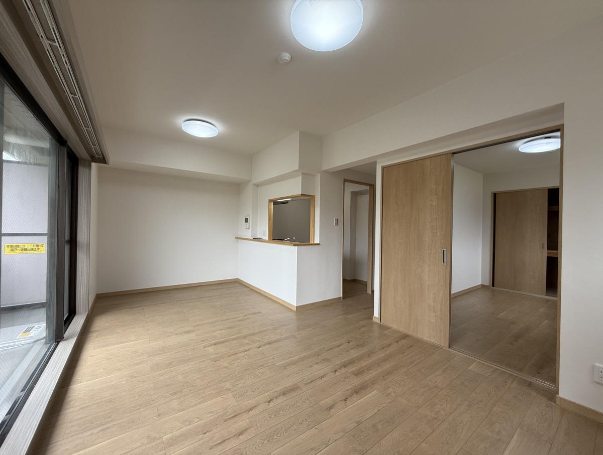 フルリノベーション物件のご紹介です!建具はすべて新設で、7.60㎡バルコニーと12.75㎡アルコープの2面バルコニーで3面採光の陽当たり・風通し良好です!LDKはカウンターキッチンで、天井仕切りがないので、帖数よりも広々した印象です!